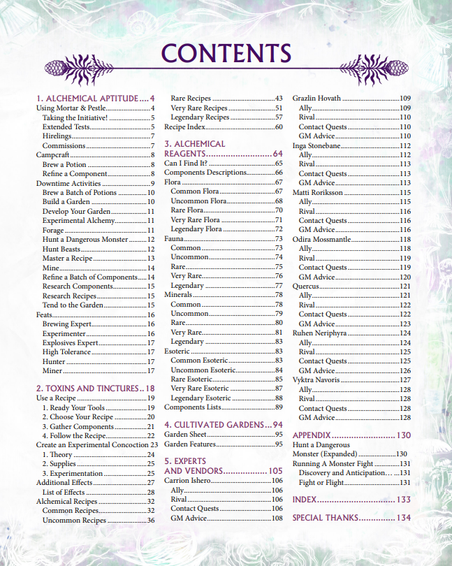 Learn the lost art of alchemy and harness the magical power innate to the Material Plane in this new 5th edition supplement! Mortar & Pestle introduces new rules for brewing potions, poisons and explosives, along with rules for finding and refining ingredients, building and tending to your garden, and hunting dangerous monsters!