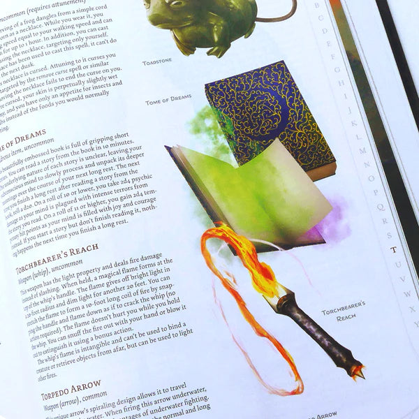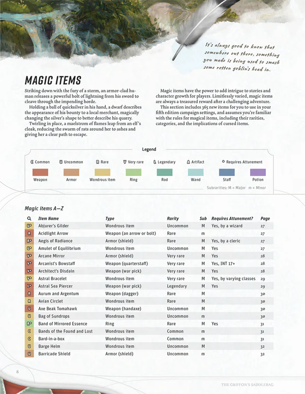 This lushly printed hardcover book is filled with 365 magic items that have been designed, illustrated, and balanced for Fifth Edition by The Griffon's Saddlebag. Fill your campaign with exciting new magical items, such as the dragon tamer's lance or catnip amulet, and reward your players with treasure as unique as their characters. Each item has also been carefully organized into easily searchable charts and random treasure tables. These magical items have been peer-reviewed by thousands of players around the world and strike a charming balance of mechanical intrigue, memorable flavor, and exciting role-playing opportunities.